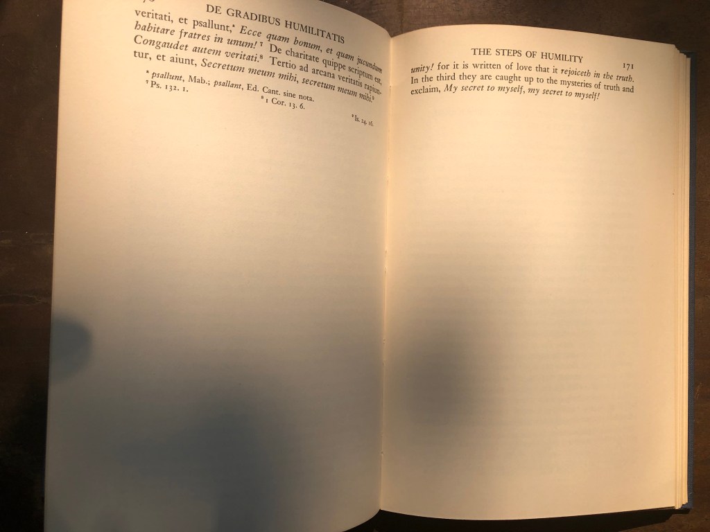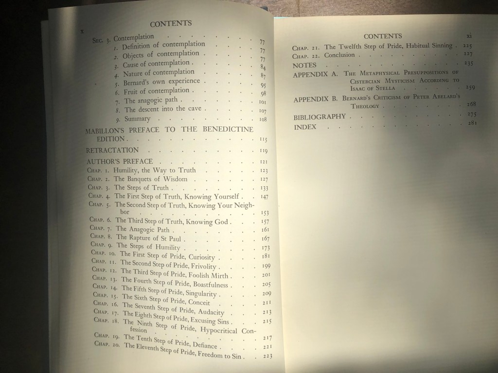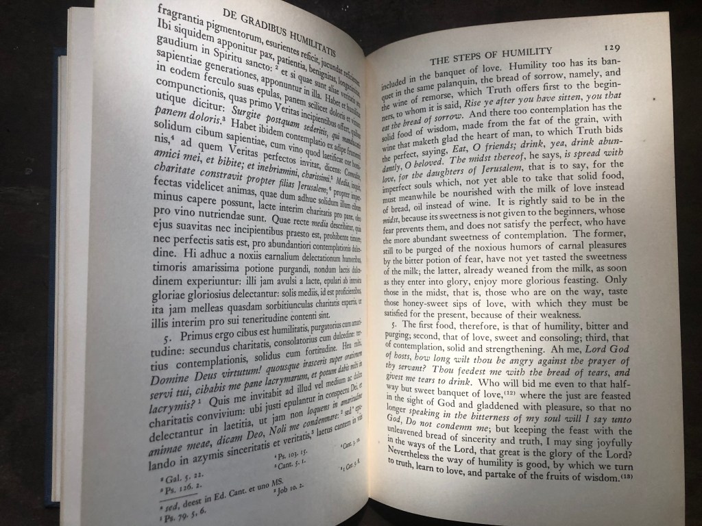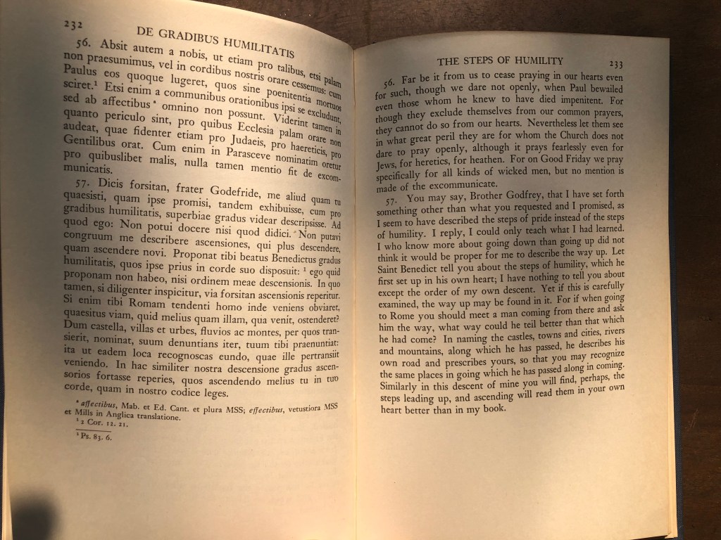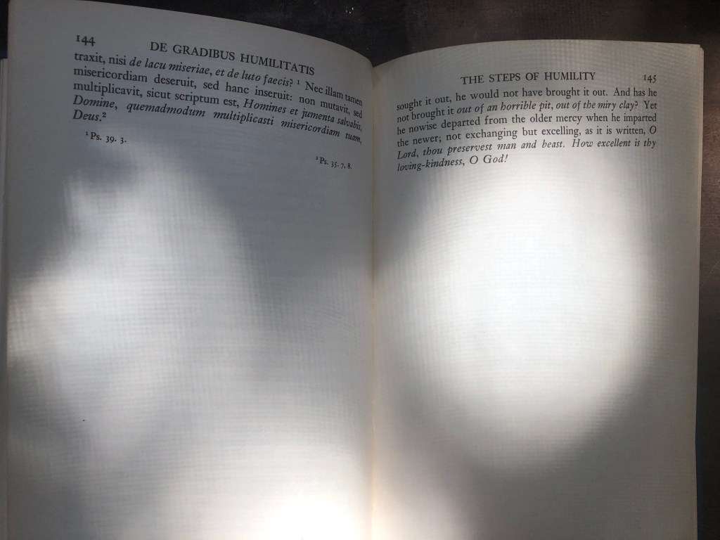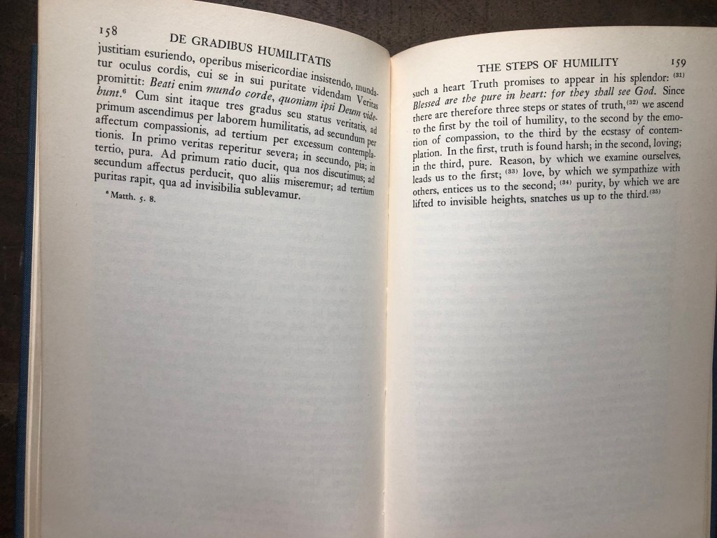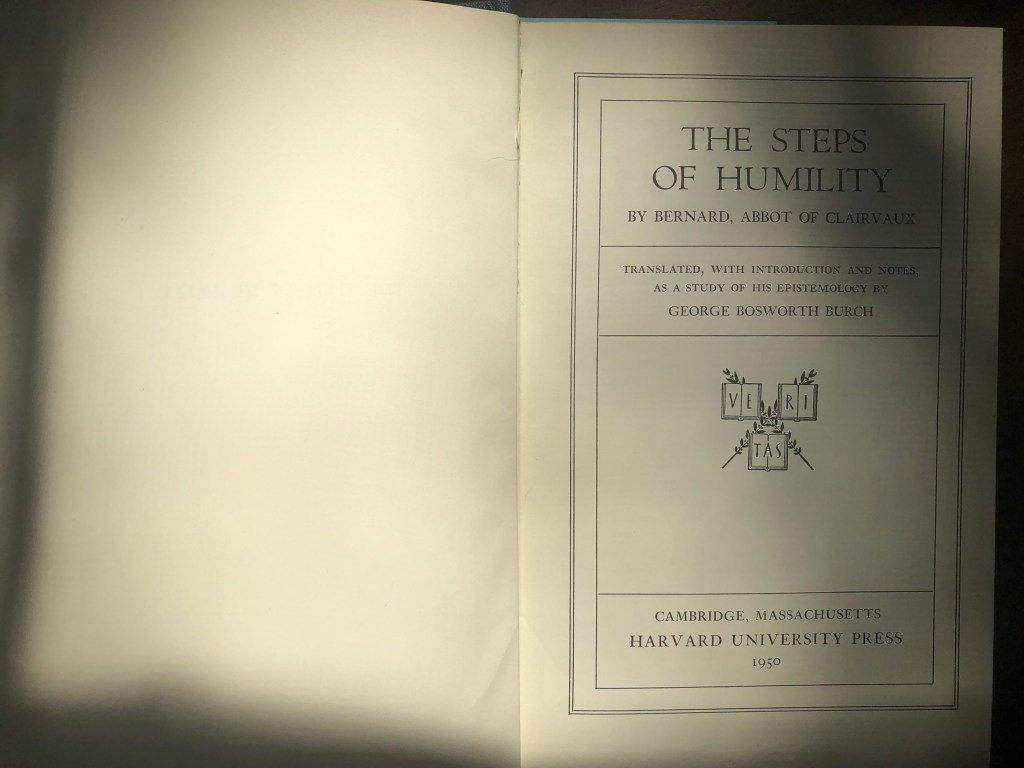 The book we will be referencing and reading from is published by Harvard University Press, 1950. Translated with Introduction and Notes, as a study of his Epistemology by George Bosworth Burch. Burch’s introduction is 112 pages long, and a very beautiful work unto itself. Perhaps there will be a separate post made on Bernard’s Epistemology as told by Burch. But for now we will focus solely on Bernard’s text, as translated by Burch. This work has appeared with slightly different titles, Degrees of Humility, The Steps of Humility & Pride. As far as I can tell these are all the same work, in different translations of the original Latin.