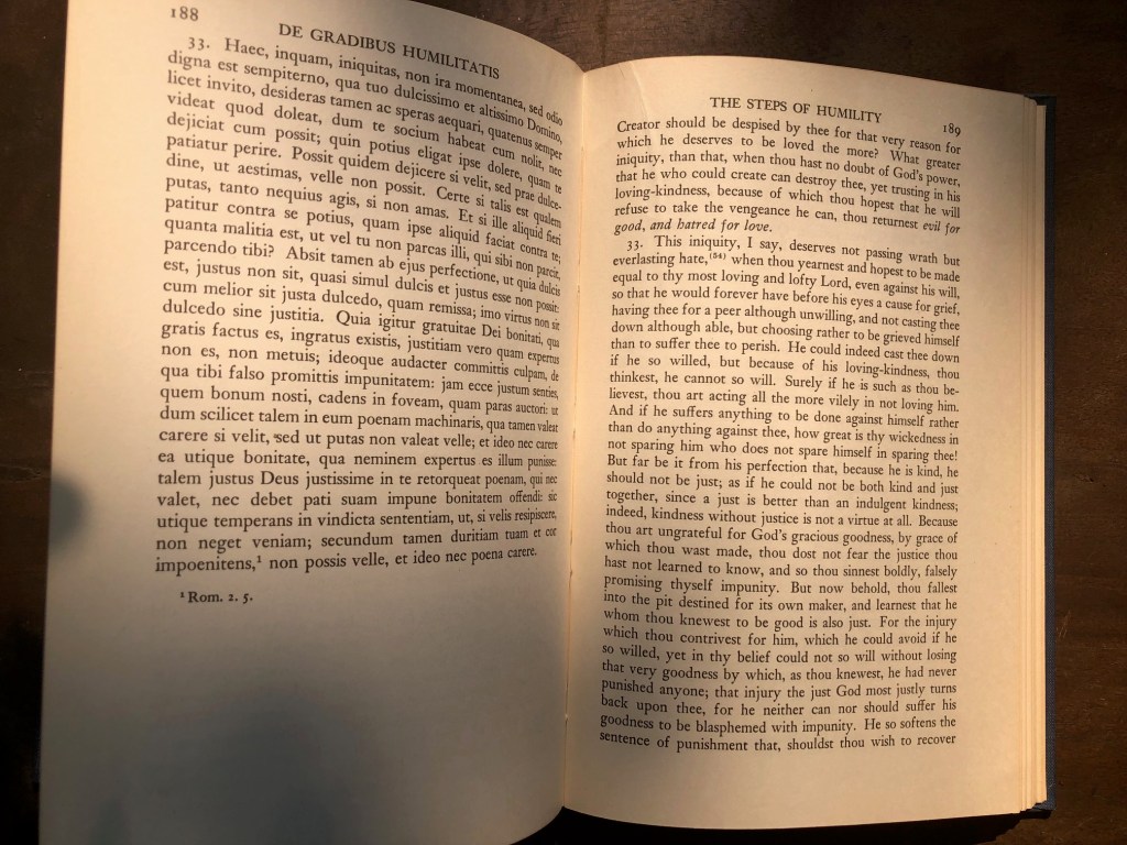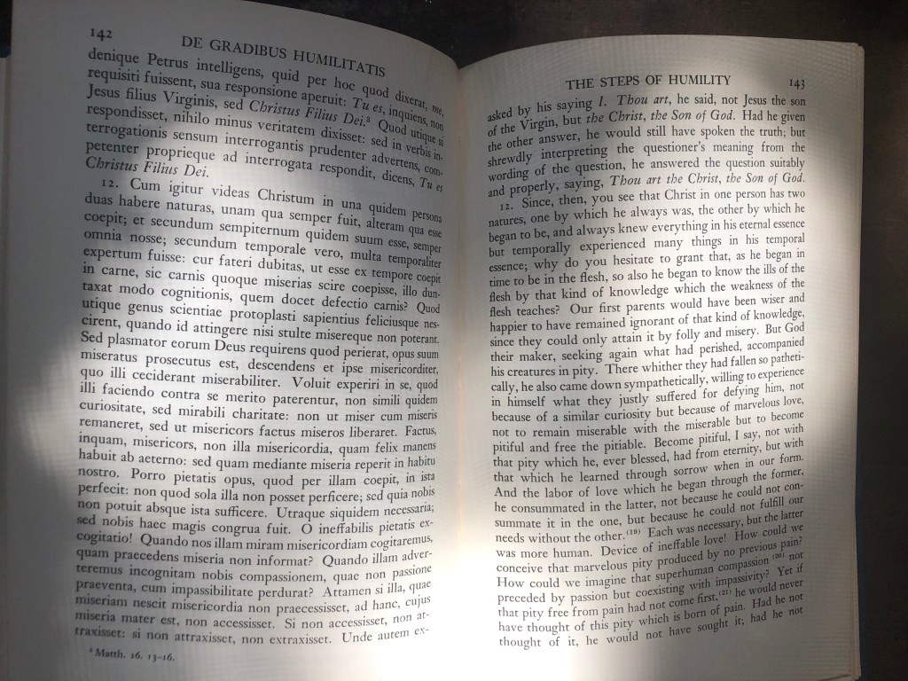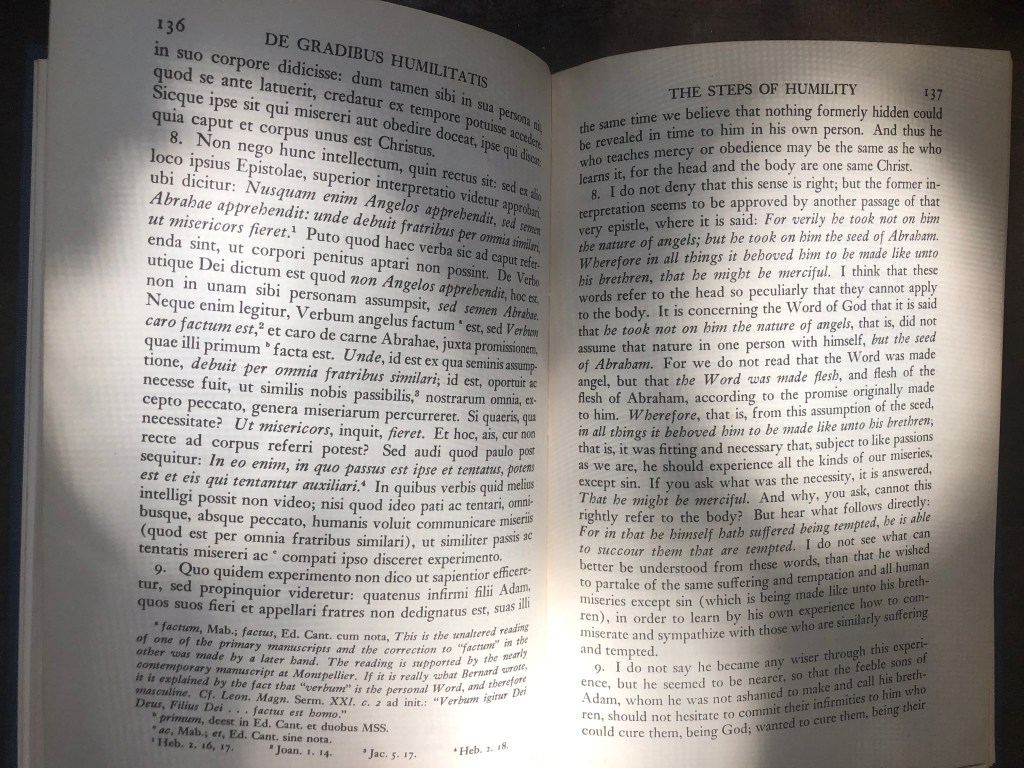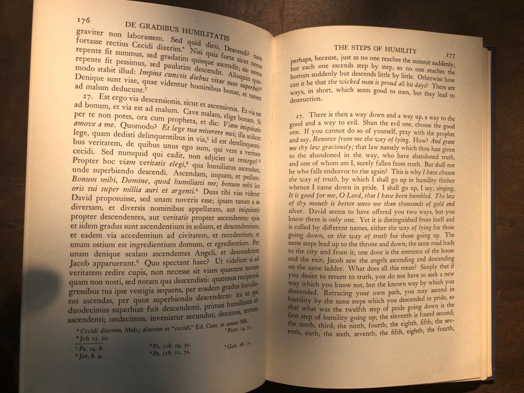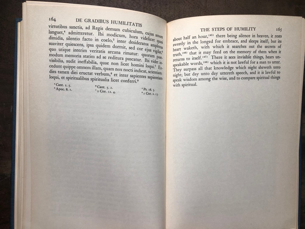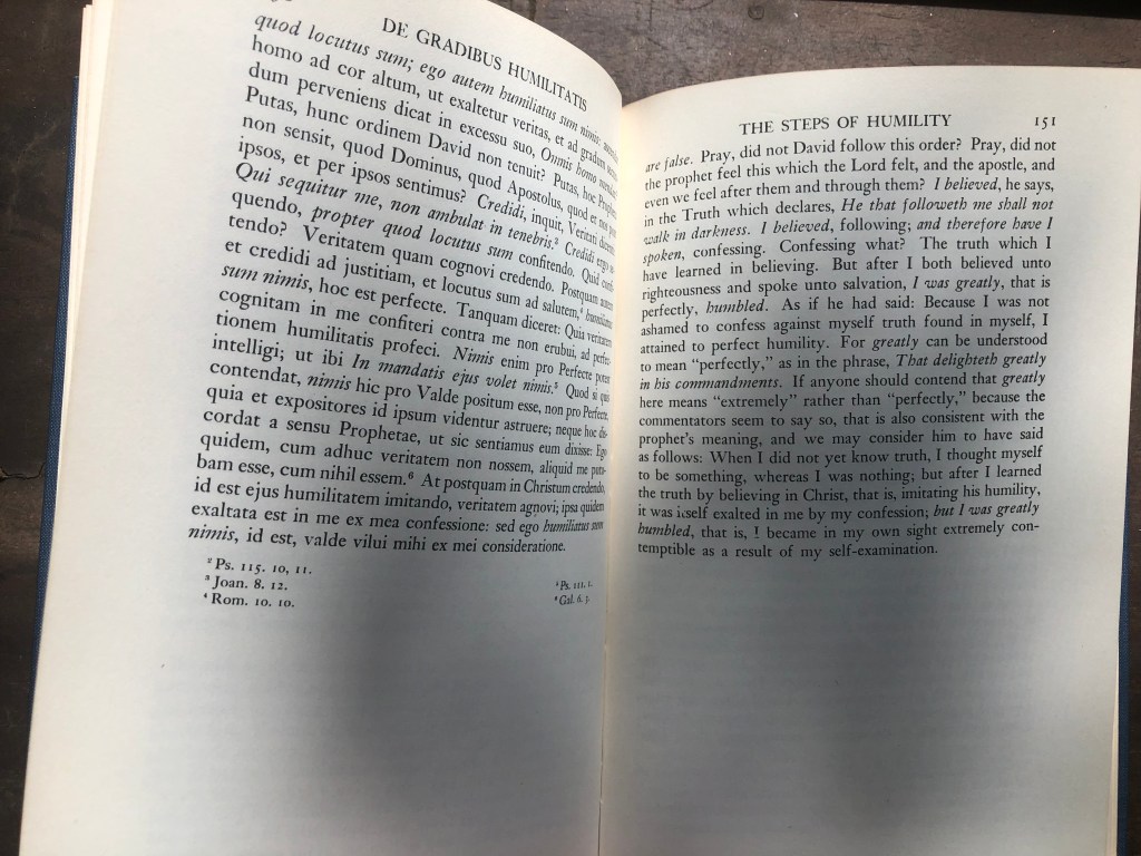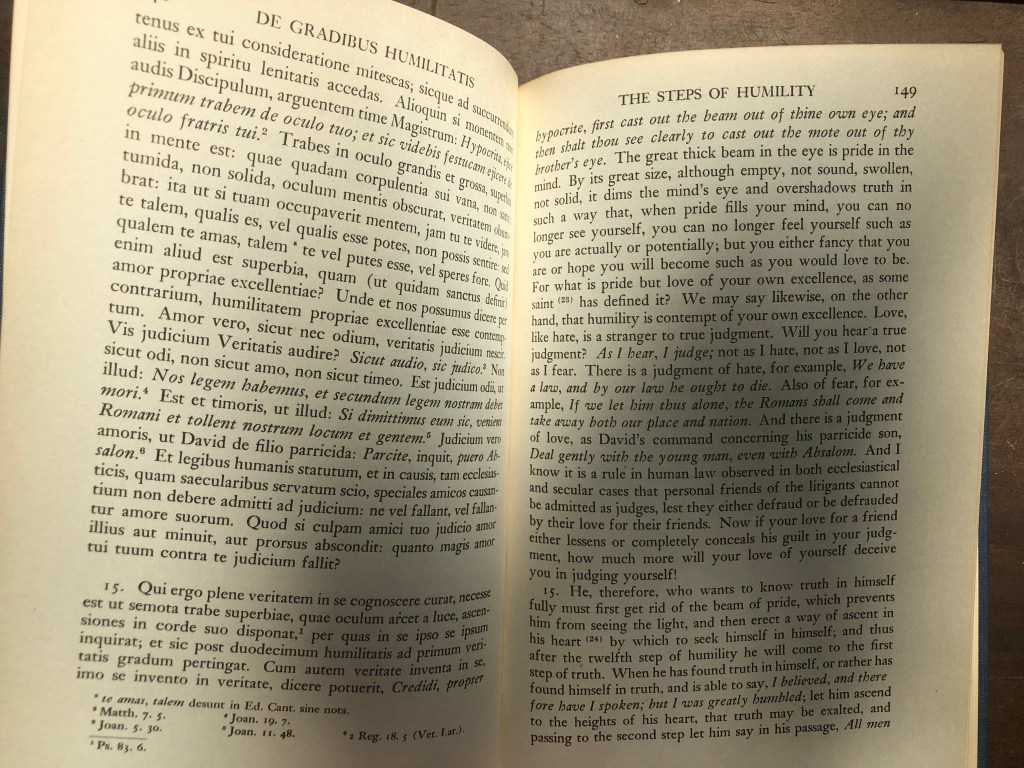 The book we will be referencing and reading from is published by Harvard University Press, 1950. Translated with Introduction and Notes, as a study of his Epistemology by George Bosworth Burch. Burch’s introduction is 112 pages long, and a very beautiful work unto itself. Perhaps there will be a separate post made on Bernard’s Epistemology as told by Burch. But for now we will focus solely on Bernard’s text, as translated by Burch. This work has appeared with slightly different titles, Degrees of Humility, The Steps of Humility & Pride. As far as I can tell these are all the same work, in different translations of the original Latin.