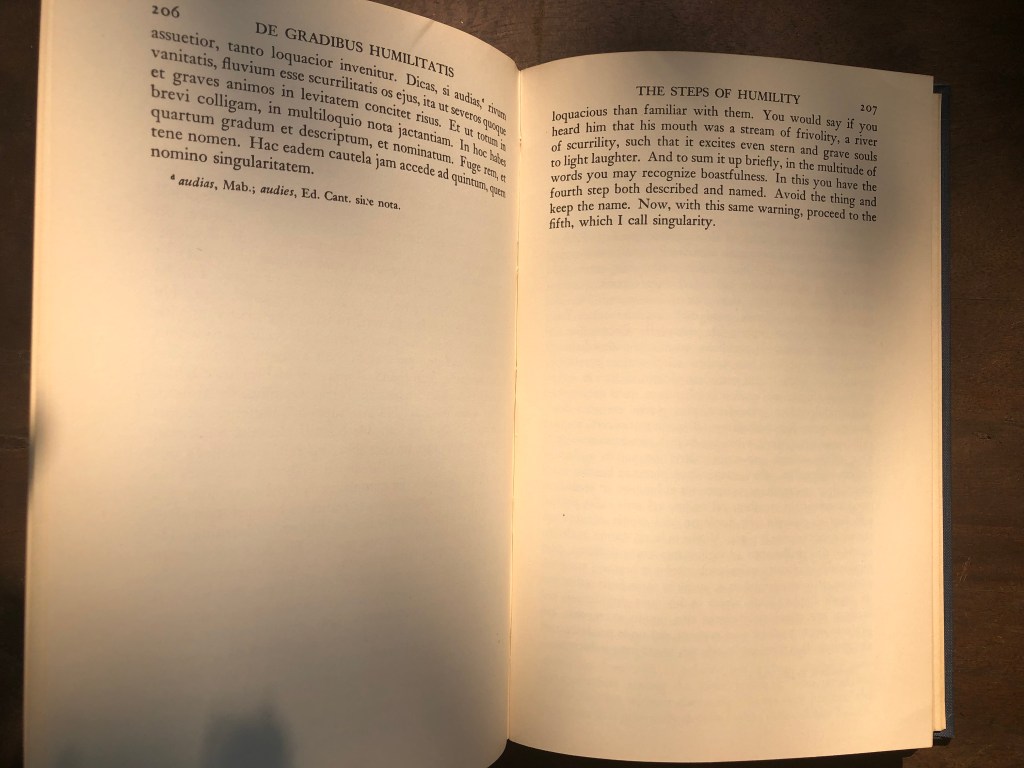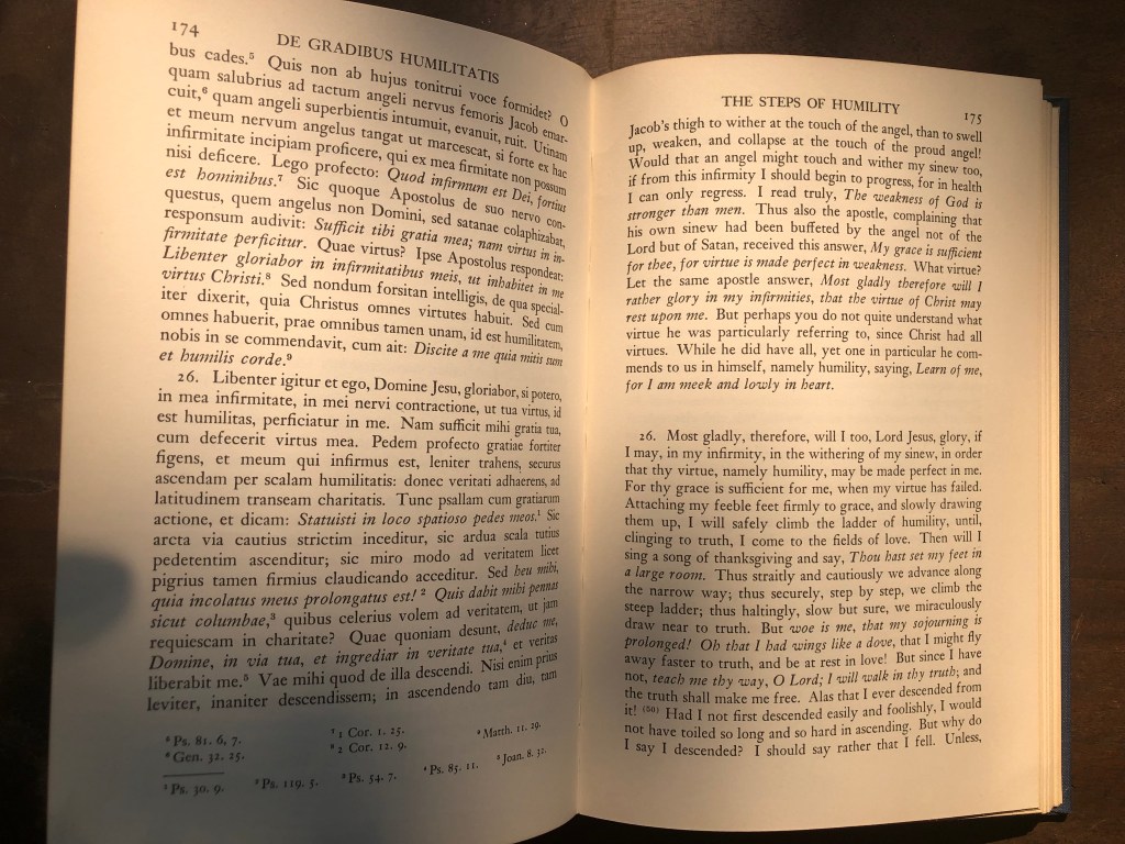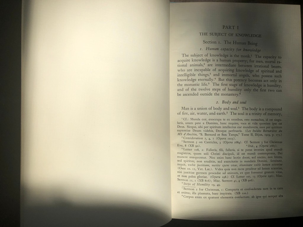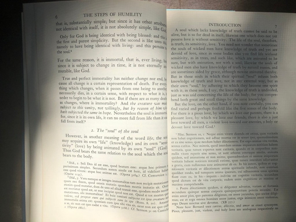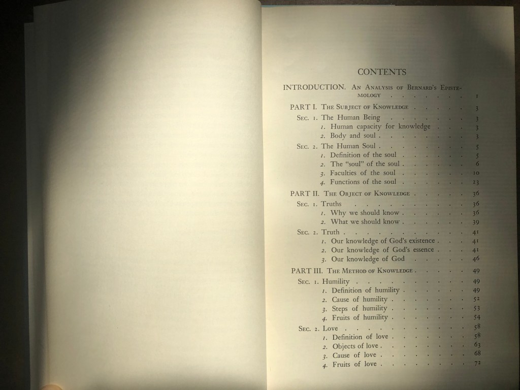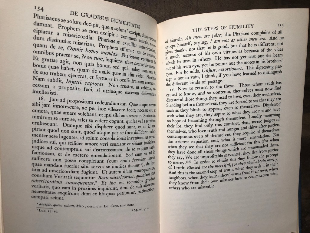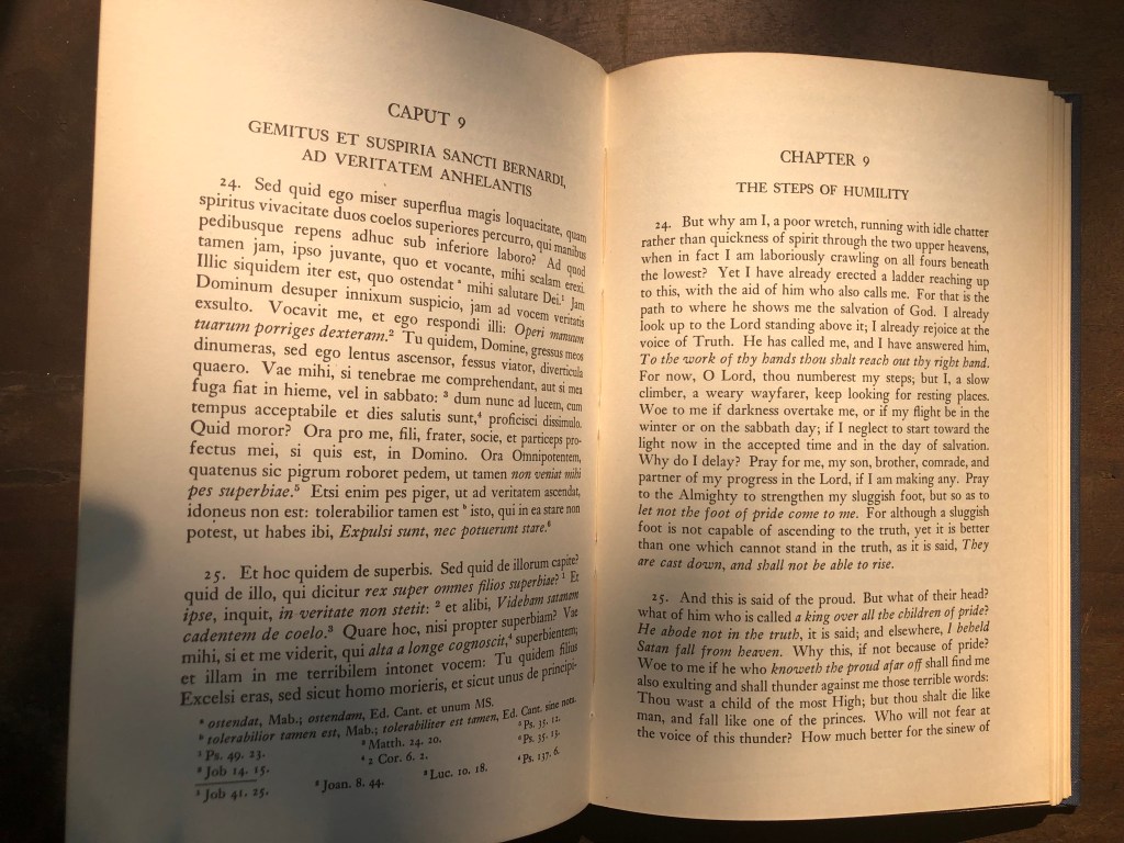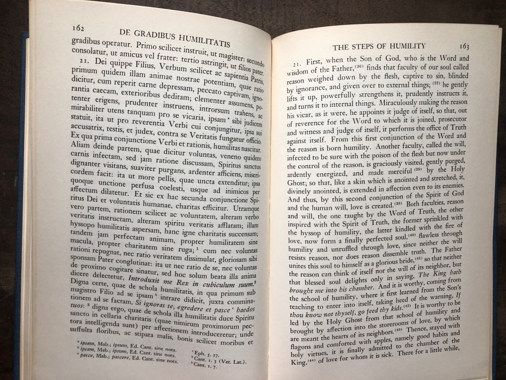The book we will be referencing and reading from is published by Harvard University Press, 1950. Translated with Introduction and Notes, as a study of his Epistemology by George Bosworth Burch. Burch’s introduction is 112 pages long, and a very beautiful work unto itself. Perhaps there will be a separate post made on Bernard’s Epistemology as told by Burch. But for now we will focus solely on Bernard’s text, as translated by Burch. This work has appeared with slightly different titles, Degrees of Humility, The Steps of Humility & Pride. As far as I can tell these are all the same work, in different translations of the original Latin.