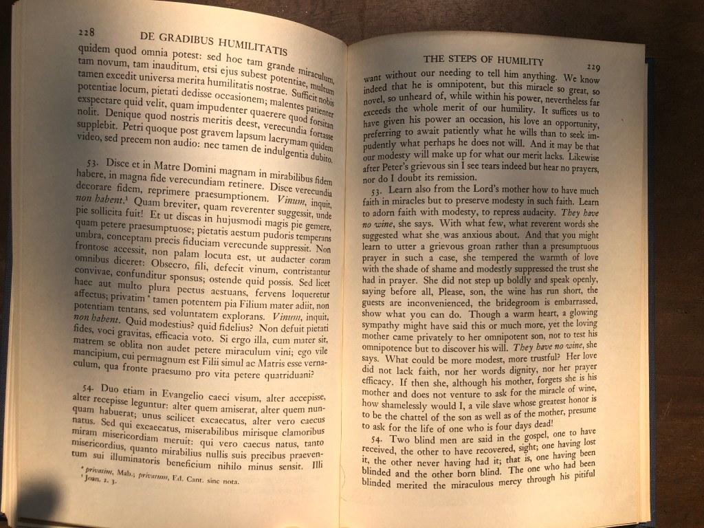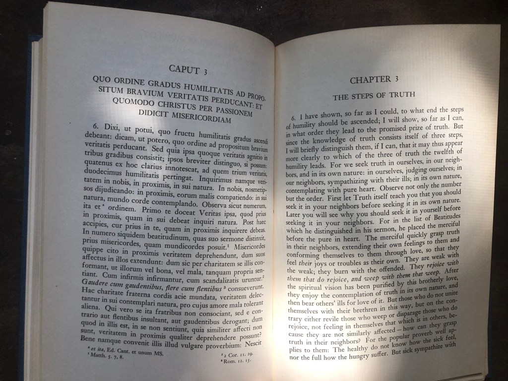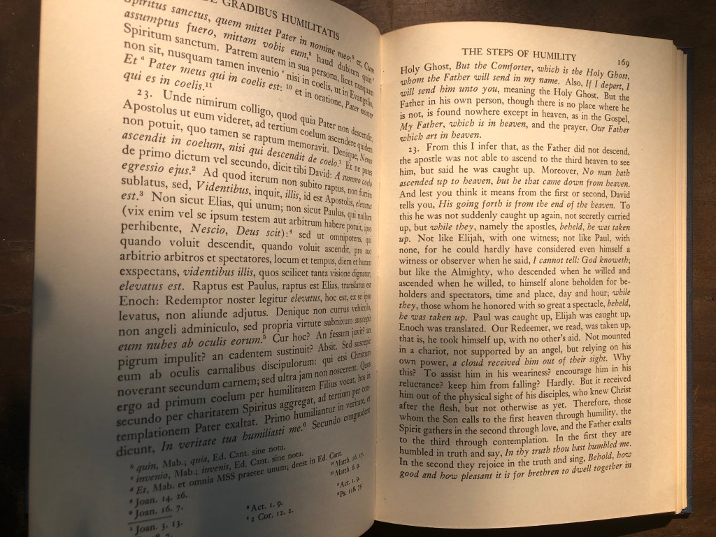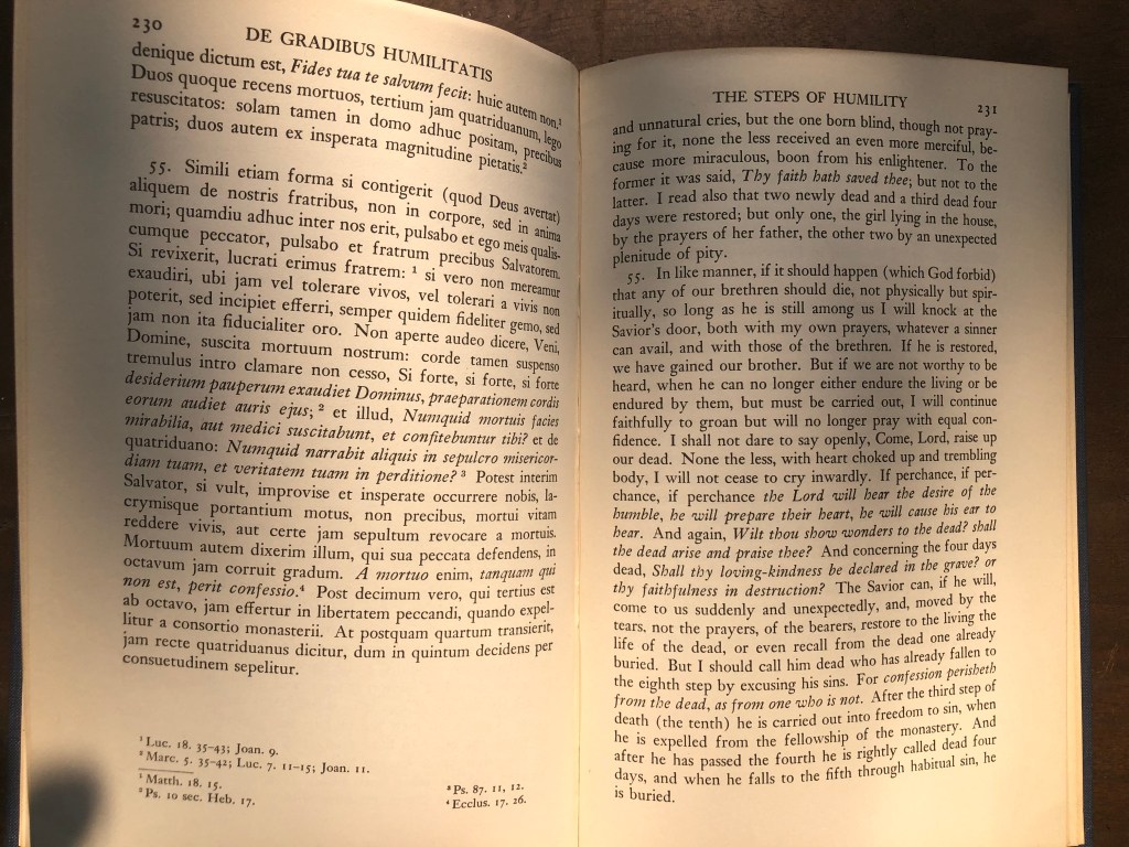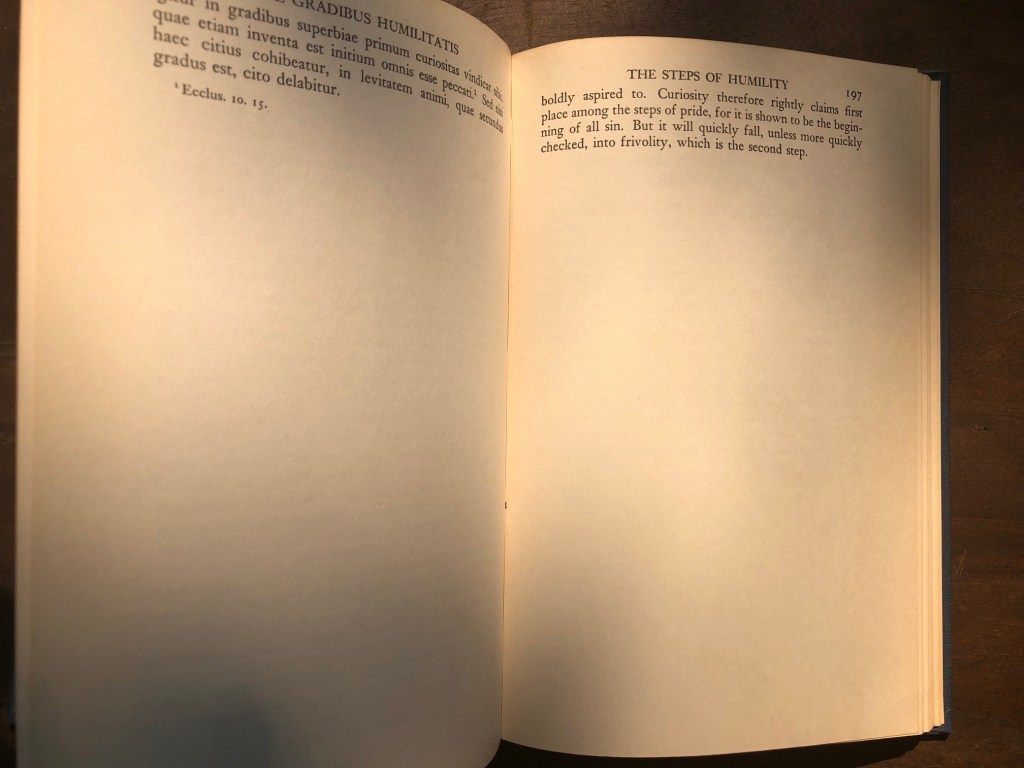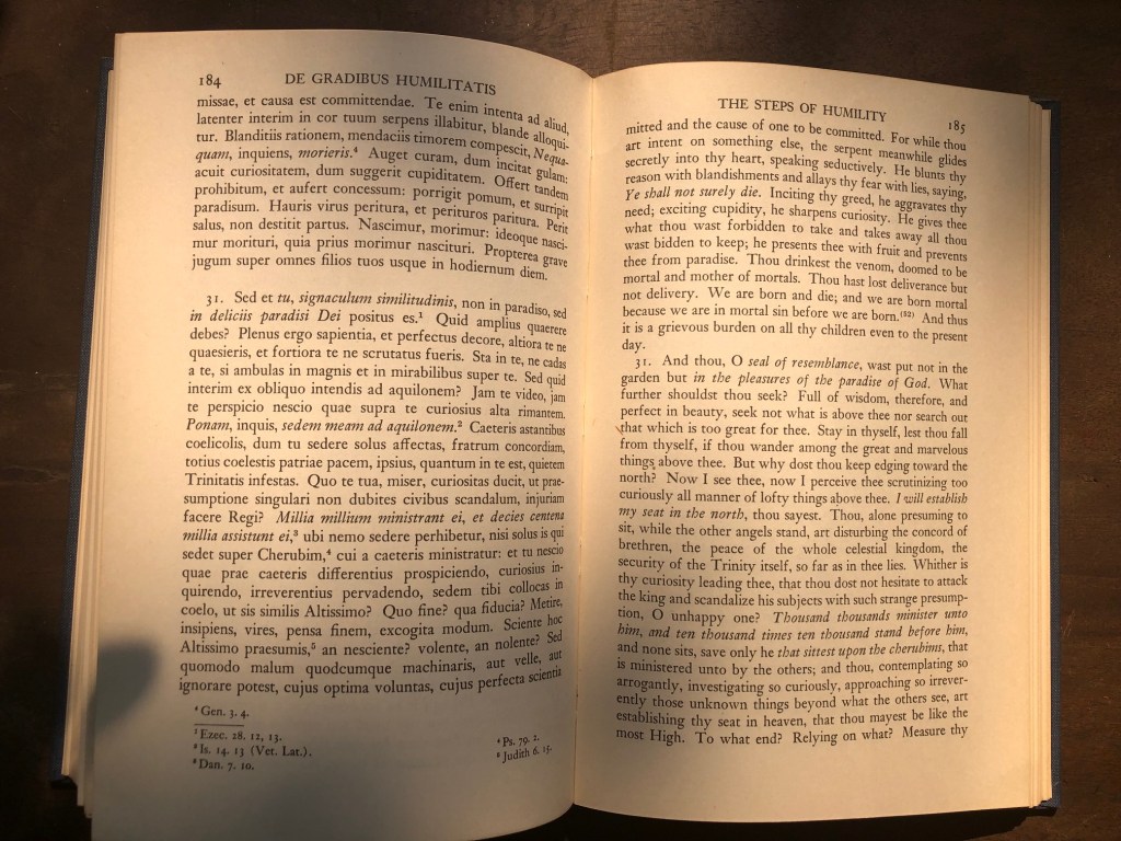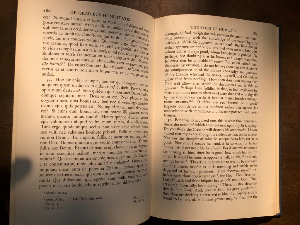 The book we will be referencing and reading from is published by Harvard University Press, 1950. Translated with Introduction and Notes, as a study of his Epistemology by George Bosworth Burch. Burch’s introduction is 112 pages long, and a very beautiful work unto itself. Perhaps there will be a separate post made on Bernard’s Epistemology as told by Burch. But for now we will focus solely on Bernard’s text, as translated by Burch. This work has appeared with slightly different titles, Degrees of Humility, The Steps of Humility & Pride. As far as I can tell these are all the same work, in different translations of the original Latin.