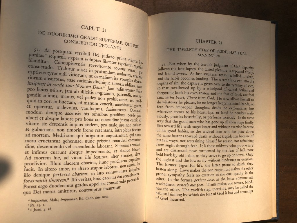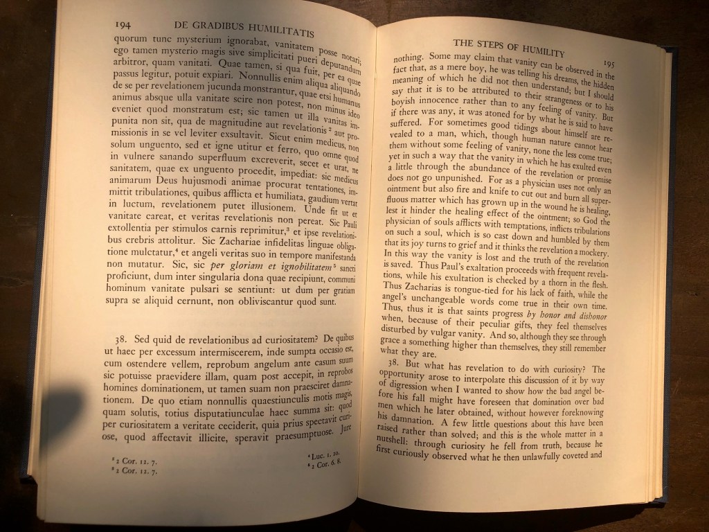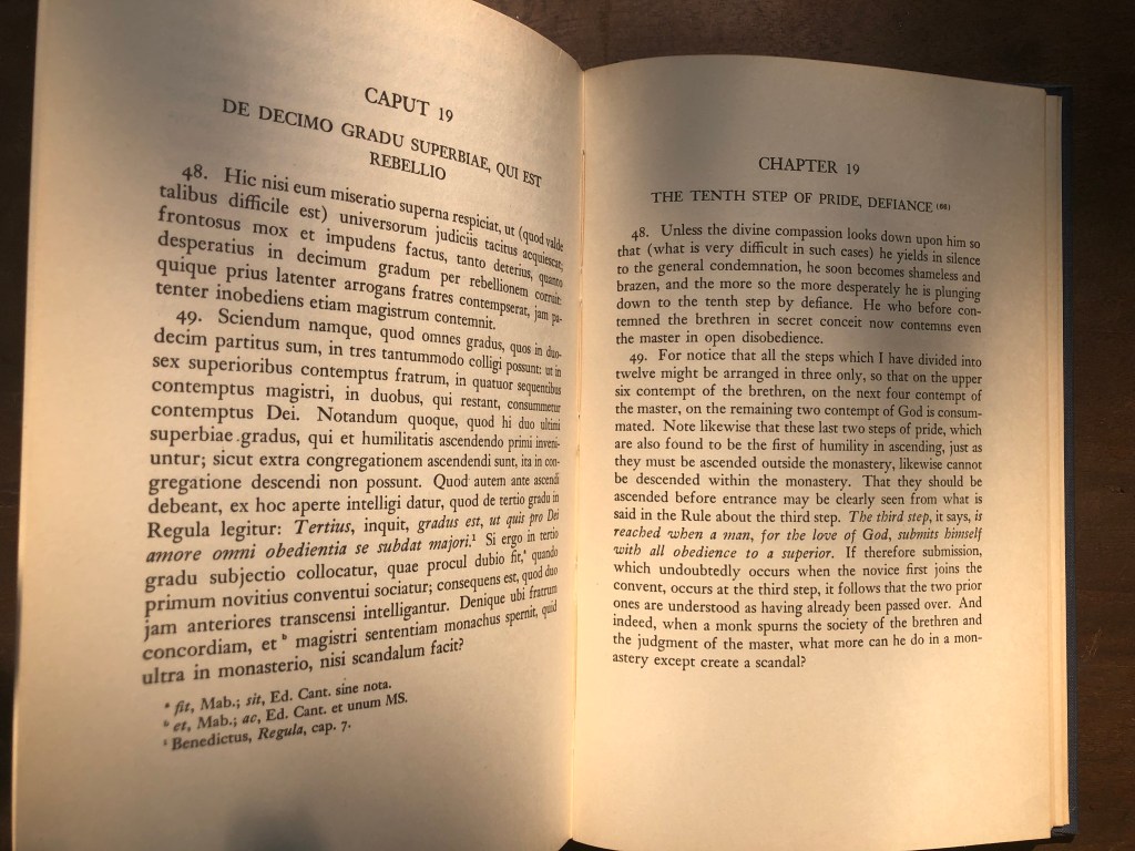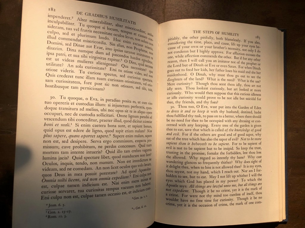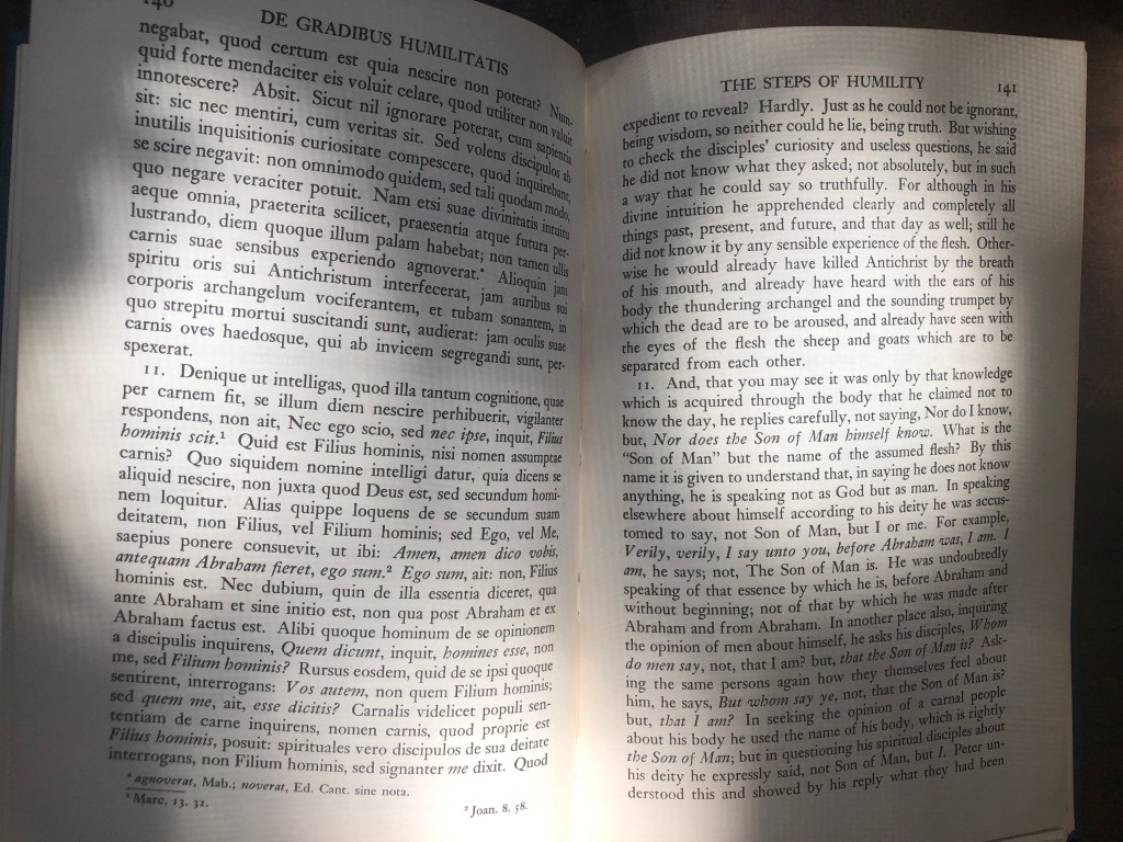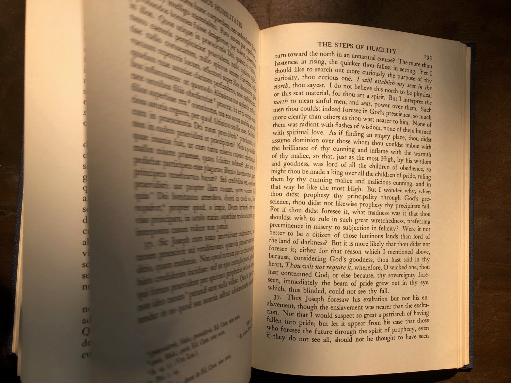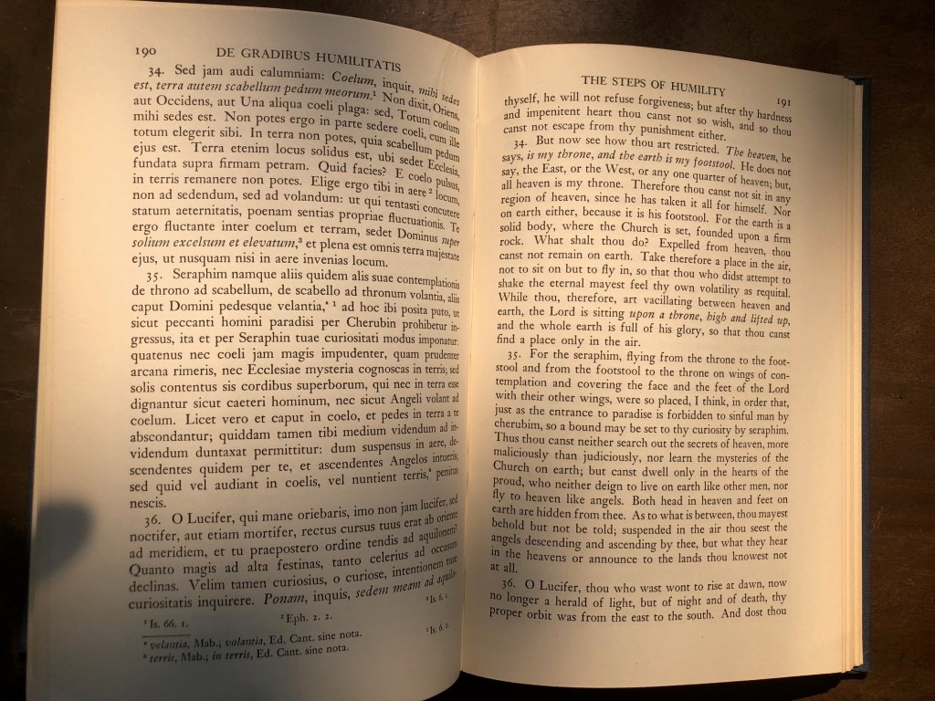 The book we will be referencing and reading from is published by Harvard University Press, 1950. Translated with Introduction and Notes, as a study of his Epistemology by George Bosworth Burch. Burch’s introduction is 112 pages long, and a very beautiful work unto itself. Perhaps there will be a separate post made on Bernard’s Epistemology as told by Burch. But for now we will focus solely on Bernard’s text, as translated by Burch. This work has appeared with slightly different titles, Degrees of Humility, The Steps of Humility & Pride. As far as I can tell these are all the same work, in different translations of the original Latin.