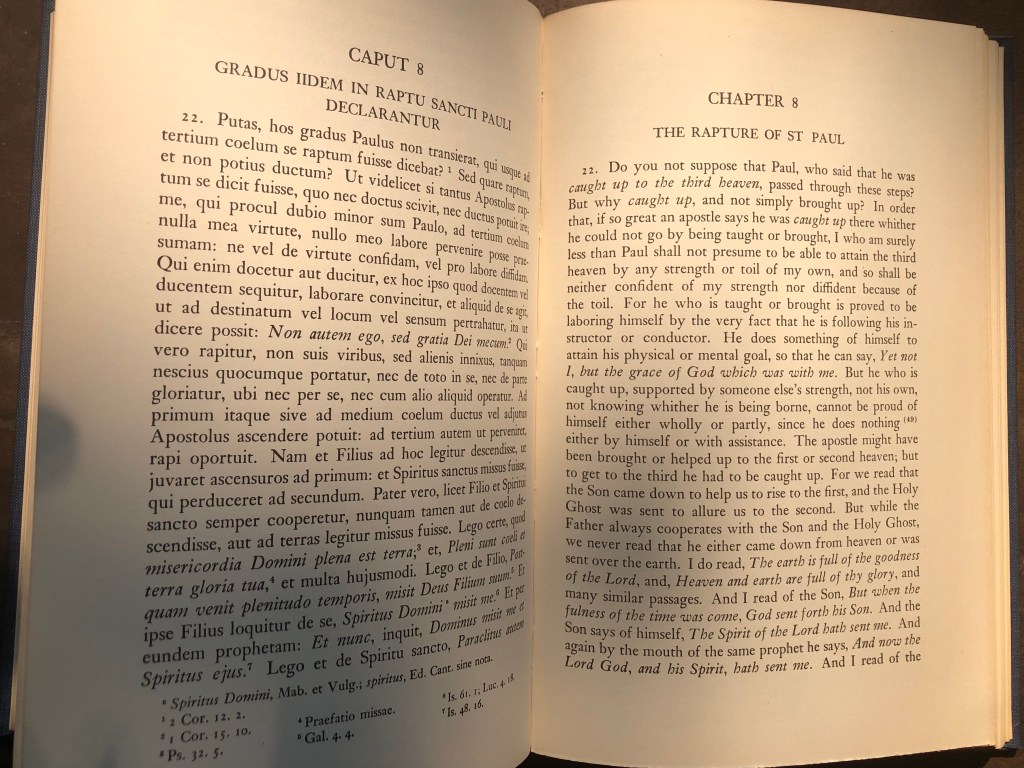 We open this chapter in wonder at the particular notion of St. Paul being caught up to the third heaven, rather than taught how to reach it, or brought there by his own will. The important recognition is that it is not by our own strength that we ascend, but by the grace of God. Bernard elaborates the theology of the Trinity in relation to the steps. The first heaven and first step can be taught by the Son through humility, the second heaven can be reached with the spirit of the Holy Ghost that gathers with love, but the third Heaven is of the Father who has never descended and to reach the third heaven one may only be caught up by the Father while in contemplation.