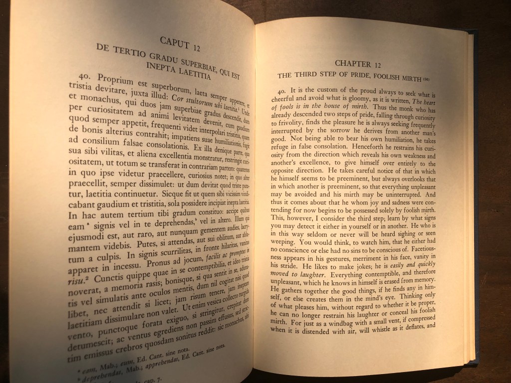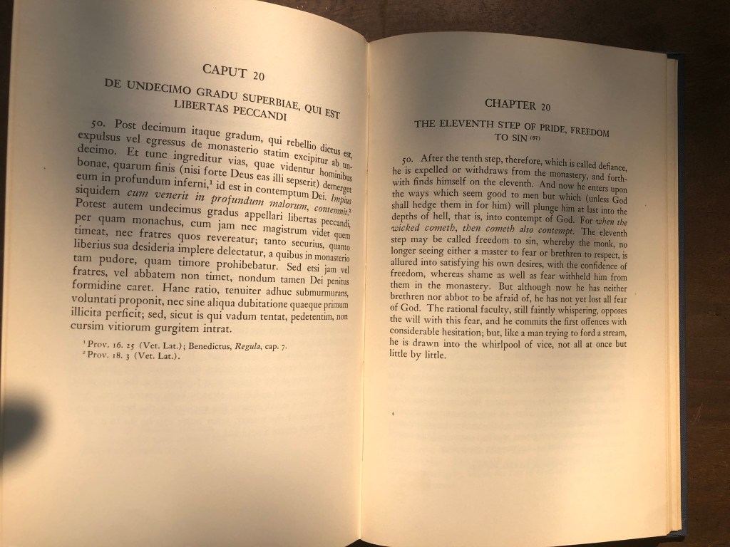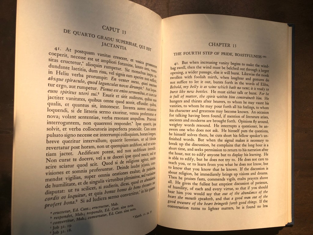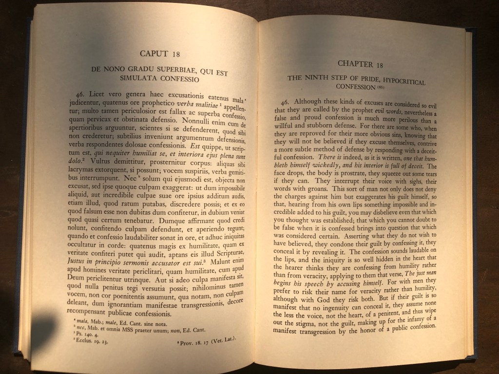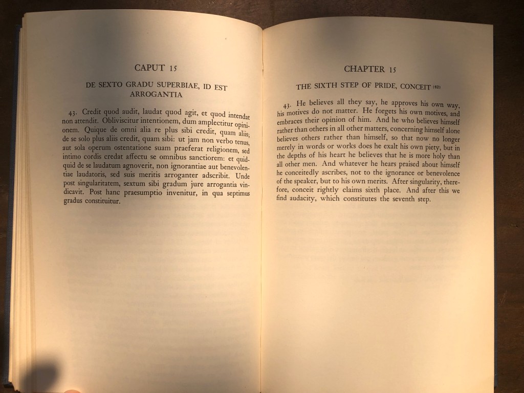 This idea of Humility as self-examination is perhaps the core of Bernard’s teaching, and will be elaborated on in future chapters. From the bread of sorrow to the steps of Pride. The text begins to facilitate this self-examination; each step of Pride is later articulated as a tool to be applied during self-reflection, to assist one in recognizing the faults and self-deceptions that would lead to the descent of Pride.