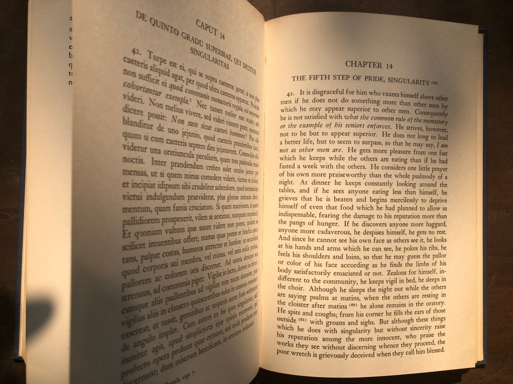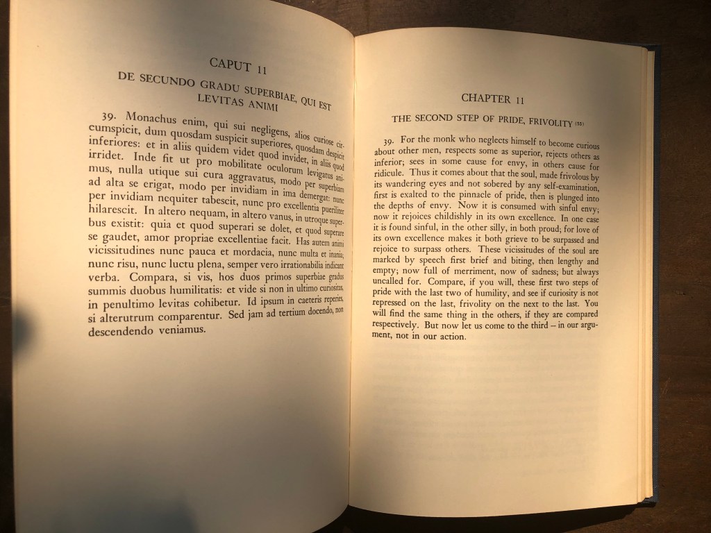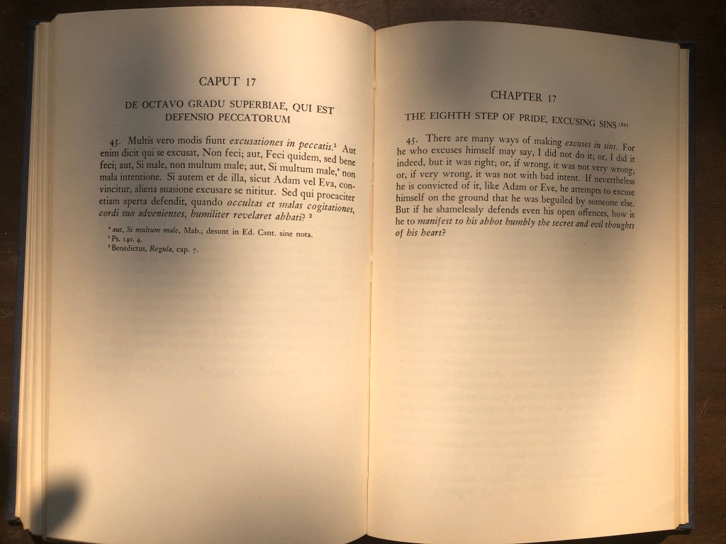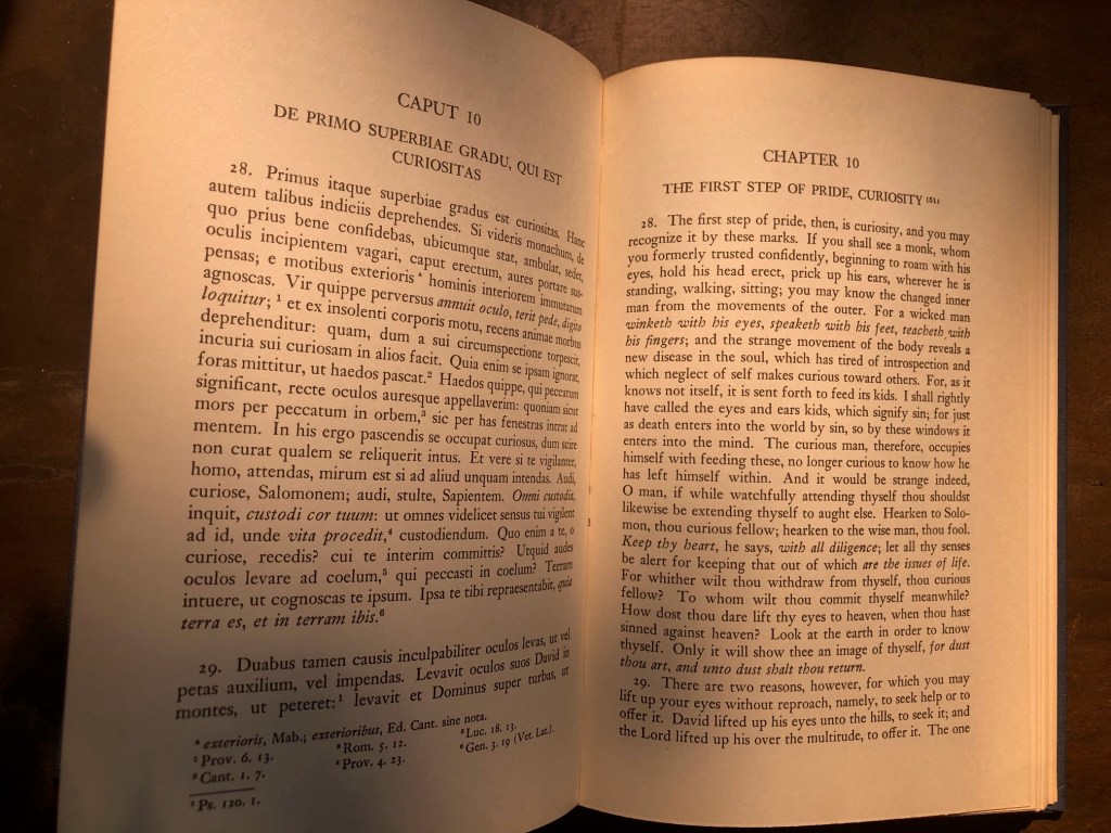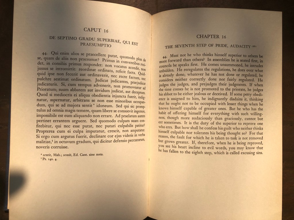 This idea of Humility as self-examination is perhaps the core of Bernard’s teaching, and will be elaborated on in future chapters. From the bread of sorrow to the steps of Pride. The text begins to facilitate this self-examination; each step of Pride is later articulated as a tool to be applied during self-reflection, to assist one in recognizing the faults and self-deceptions that would lead to the descent of Pride.