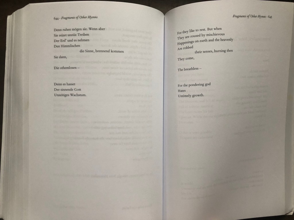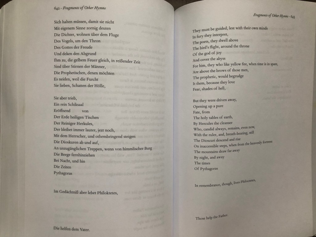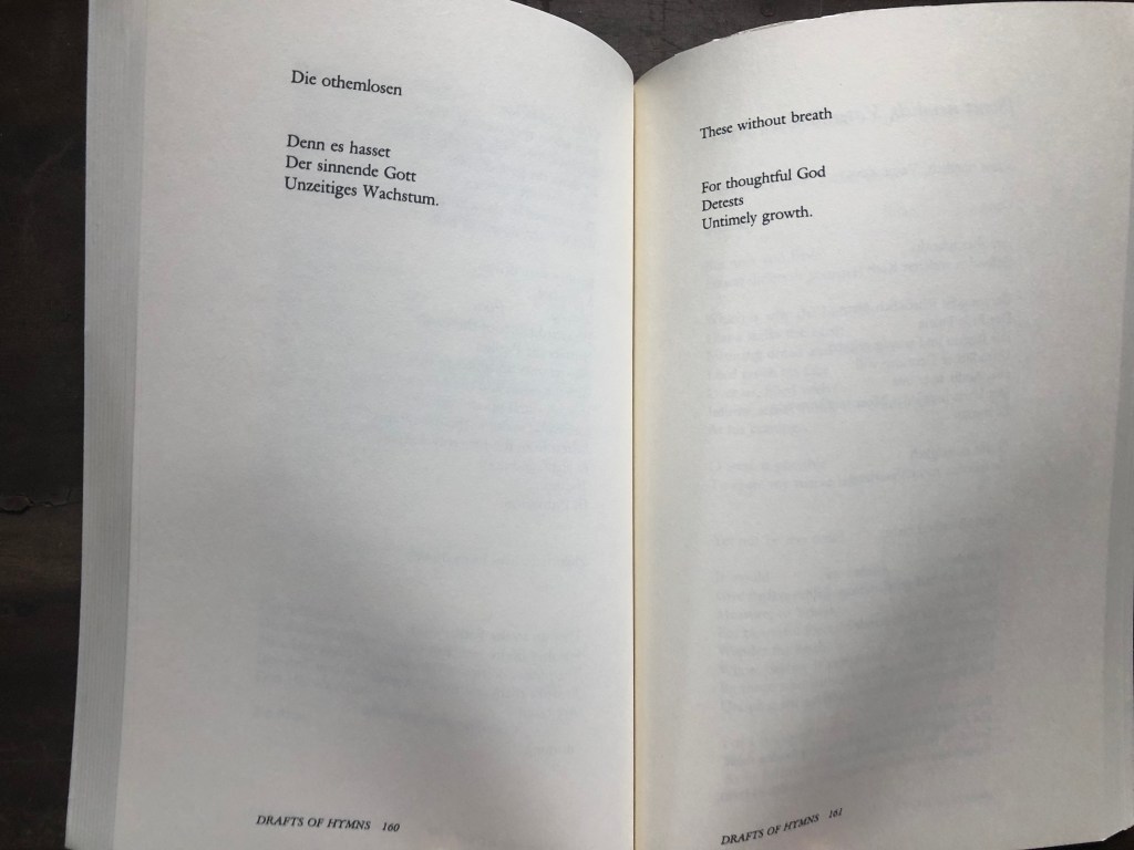 The intro to the poem is a mystery to me still. In Hamburger’s translation I am tempted to ask, are the gods building the heavens by destroying the earth, striking the mountains? Life on earth then blossoms, in the space of dearth, where “a different manner creates”. The poets roam and bare witness, overflowing with vision. But in Sieburth’s translation it appears at first that the Gods are building the earth, and shaping the mountains. But then the Thunderer almost forgets the heavens as he is absorbed in his wrath aimed at earth. It’s puzzling and mysterious – wrath and creation – the lines being blurred are those that exist between creation and destruction , earth and heaven, life and death.