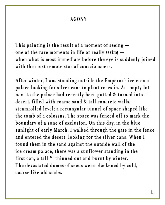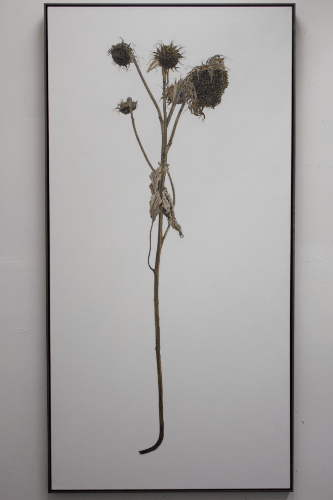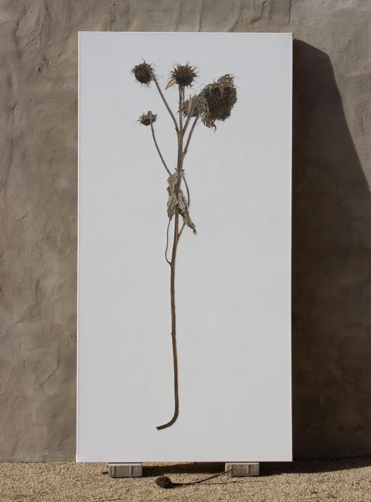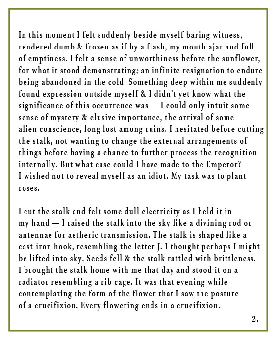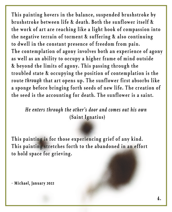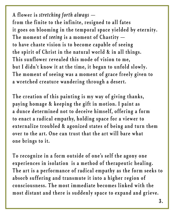 This painting is about seeing the spirit and story of Christ encoded into all of nature. The sunflower is a crucifixion, suspended in silence. The painting is an attempt to give testimony to a moment of bearing witness. Christ as eternal operates outside of time. From within time the Christ story unfolds in substance in infinite repetition and difference; the forms are many in which the unchanging reveals its absolute formlessness. The various modes of substance and stages of the story are all occurring in simultaneity and it is our perception of them that gives them time and narrative sequence. To see the world like this is chaste vision. The painting was a way to acknowledge how the sunflower dies for us in demonstration of the infinite love of Christ; the sunflower is a teacher – one of many. The creation of the seed is the accounting for death.