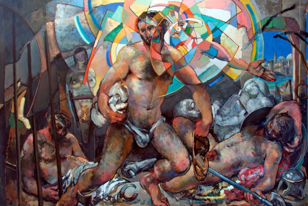 “I’m called to make art, God has to let me know how to glorify Him. A good example I think would be when my wife died, I started using the metaphor of Cubism to show the movement of the veil and behind the veil. Because in cubism it’s never set, it’s always in motion, so there’s another kind of reality that you’re dealing with other than our earthly reality and I was combining the two. In this process I found I had actually done something like that very early in my work when I had done a while series called Intrusions when I was using abstract expressionism as a metaphor. I was with a group and friends with people at Princeton. There were two Russian scholars there…they were turning the whole icon upside down and reevaluating it…what they found was that in the icons there were buildings that were drawn and people thought they were just poor drawing, they just didn’t know how to do it. They reevaluated it and showed that the buildings were being seen from different points of view at the same time. In other words, it was Cubism. And it was only in heavenly buildings that were not meant to be built. In other words, they were using the same metaphor for heavenly places that I was in my work. And I mentioned what I was doing very briefly and they were ecstatic. In fact, during the lecture, one scholar dealt with the veil, and he came to me after and said, the veil was for you. But you see god had directed me to come to an understanding that was 1,000 years old, and I had no idea, but he brought me to that point and that is exactly what he does.”