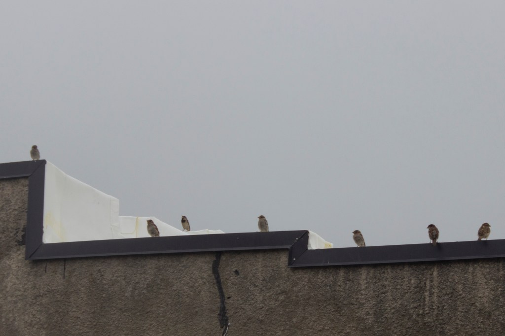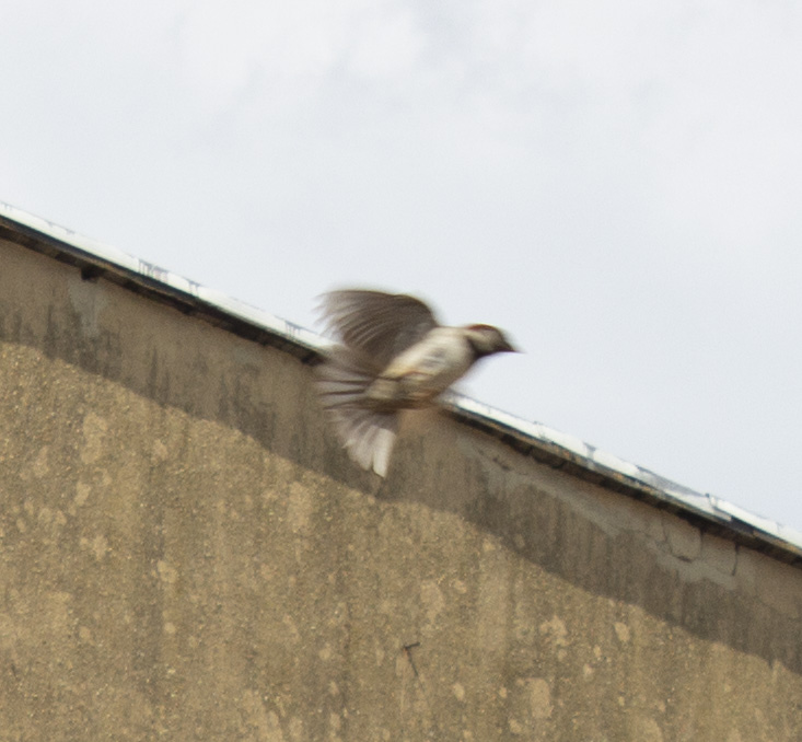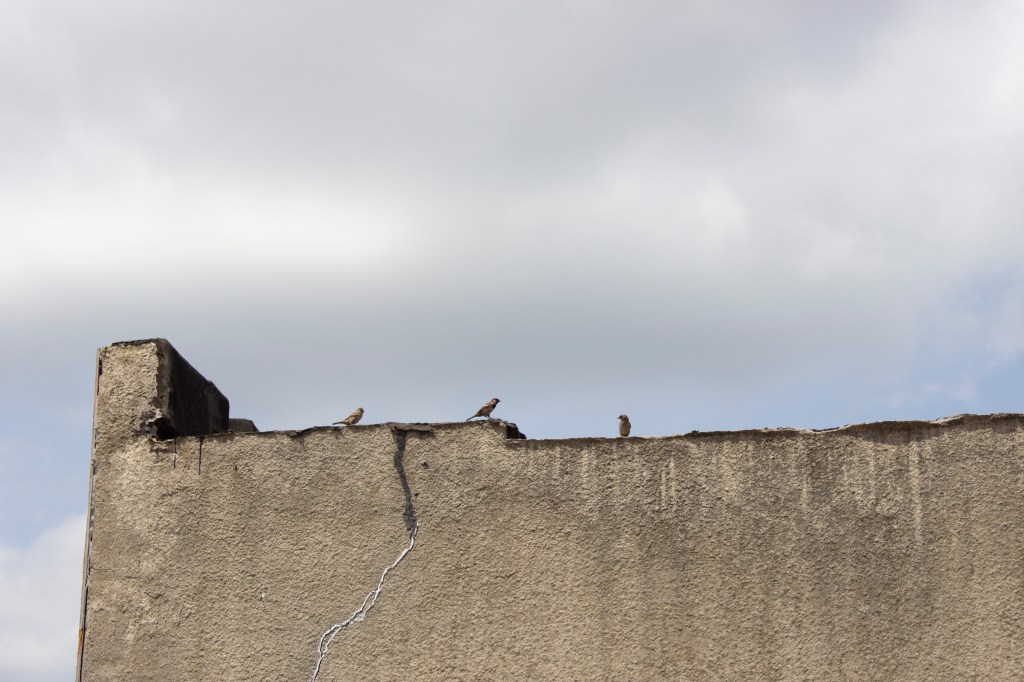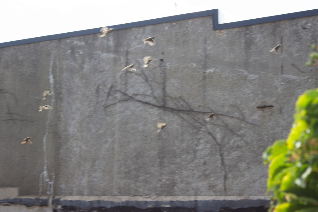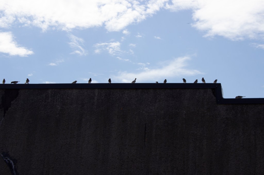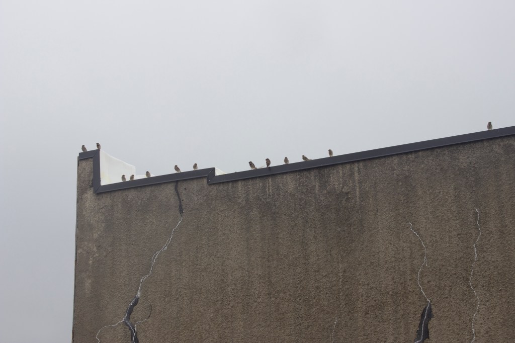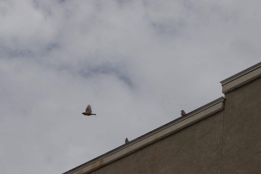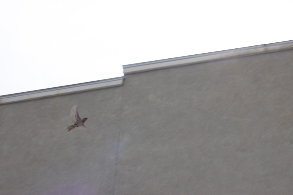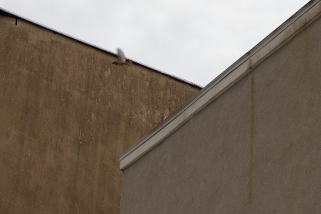 I feed the birds on the roof of an ice cream parlor and each morning I climb up the building and renew the food, I bring my camera and try to photograph the sparrows, mourning doves, pigeons and crows as they encircle the roof top and land, perch watching and take flight. As I try to photograph them I end up capturing fragments of buildings and airspace, blurry birds, or those that have perched on the edges. In repetition, day after day, I’m beginning to learn to inhabit the perceptual space of the frame in which architecture becomes fragmented and blurry as one’s vision enters the speed of the flight of sparrows through angles of light. The edges of the buildings demarcate the perch spaces and fly-zones of the sparrows, and also resemble some of the geometric angles used in the cubist paintings.