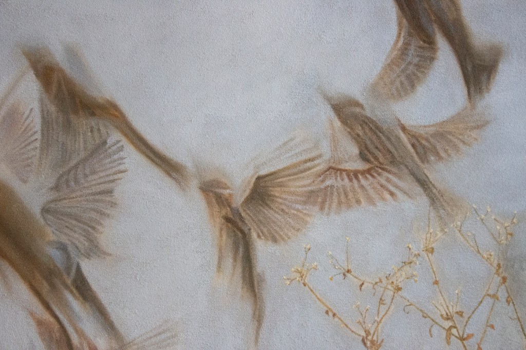 I’ve painted the first study of the Sparrows in the Middle Air, the painting style is very pared down and vulnerable, letting the brush strokes be what they are. I plan to extend this study into many more works and unfold the inspiration.