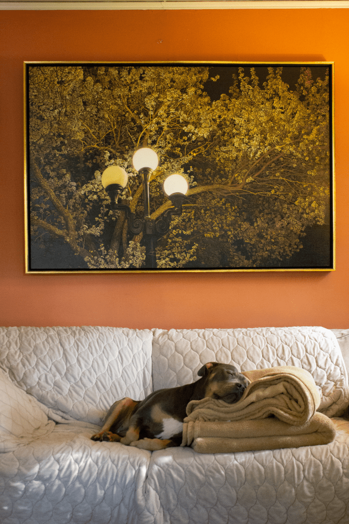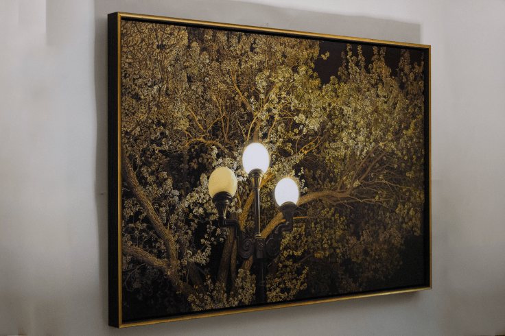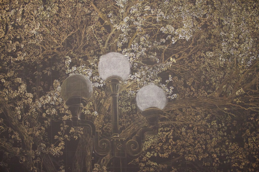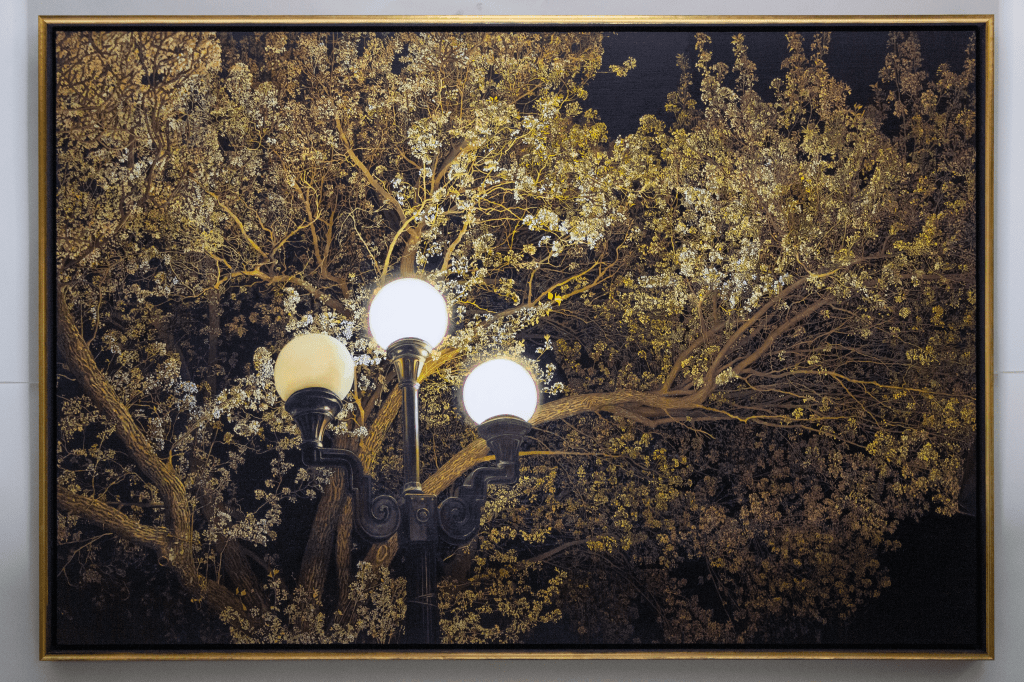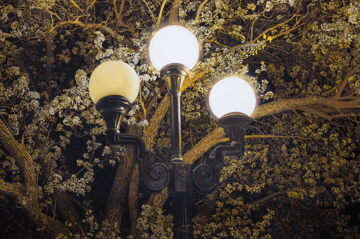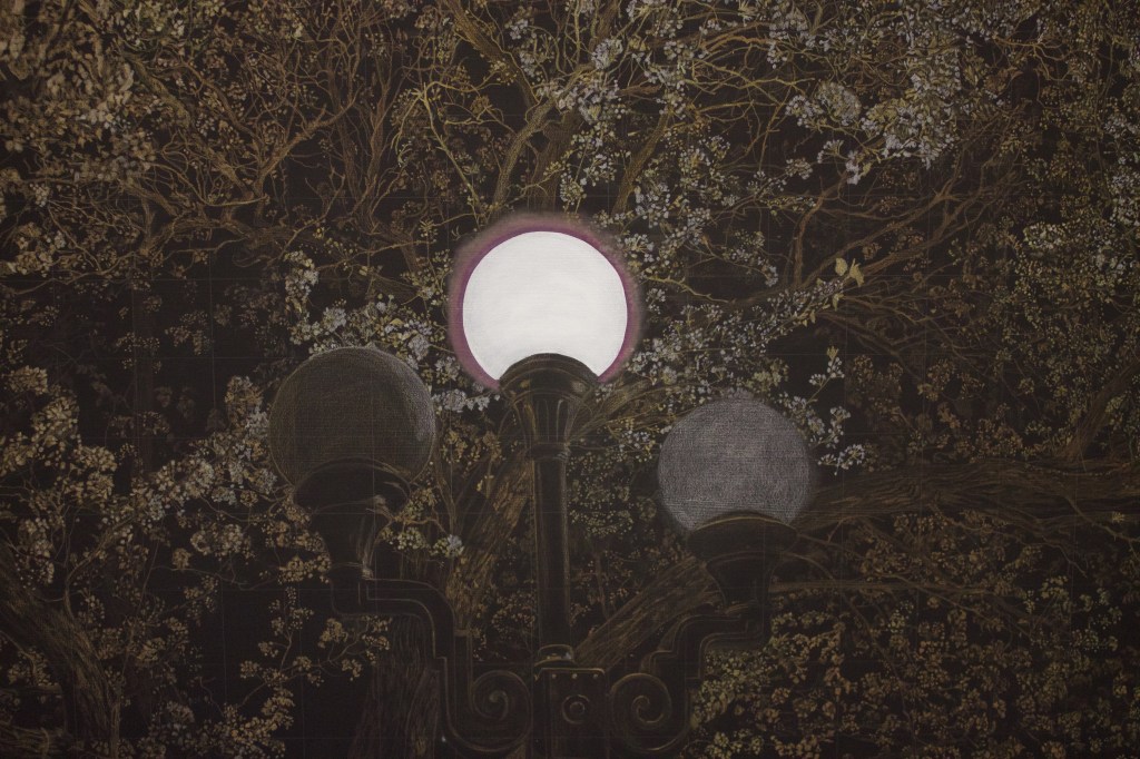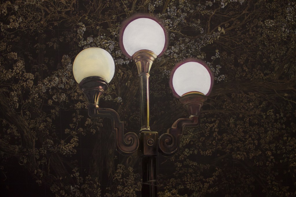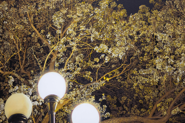 The Golden Bough is a branch from a sacred tree that allows safe passage through the underworld. The mythology comes from Virgil’s Aeneid, an ancient Roman poem, written between 29-19 BC. In book 6, Aeneas journeys to the underworld to find the shade of his father, who presents him with a vision of his destiny. Before passing into the kingdom of the dead, Aeneas is directed by Apollo’s seer that in order to find passage he must first find the Golden Bough, an anomaly within the order of nature, hidden in Diana’s sacred grove. It glows with a discolored aura. As he searches for the bough two doves appear to guide him to the branch, sent by his mother, Venus. In the painting, the two illuminated globes felt like an homage to the twin doves and also create the discolored aura of the tree. The lamp with the dead bulb seemed to suggest somehow the land of the dead.