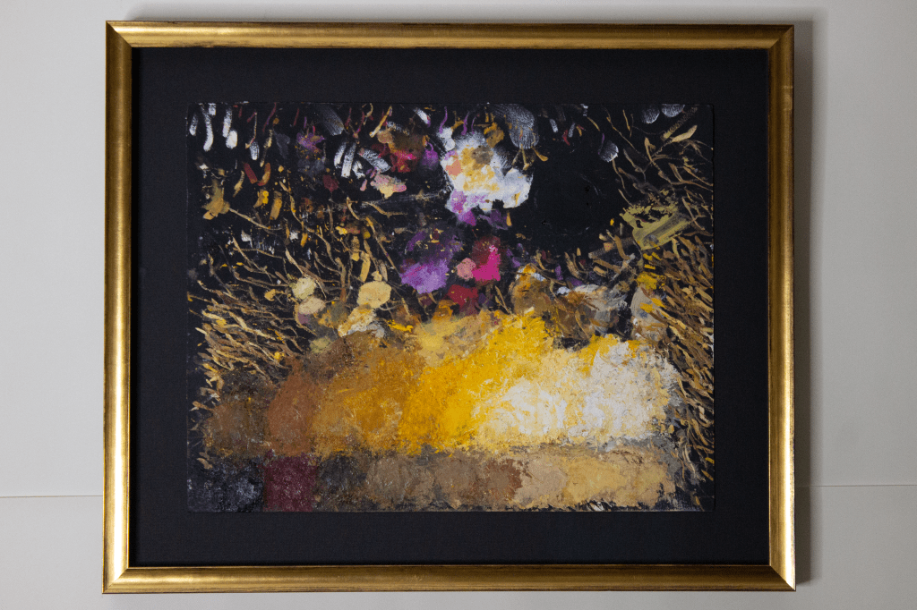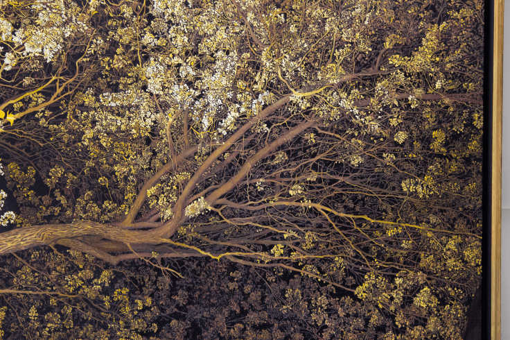 The painting is in some way a Golden Bough in the sense that the process with it was a symbolic passing through an underworld for me as the painter engaged in a pursuit. On a technical level the painting was painted “in reverse”, from light to dark. The black paint of the background was painted after the branches, and in my opinion the blackness is it’s own presence in the painting, rather than just negative or empty space.