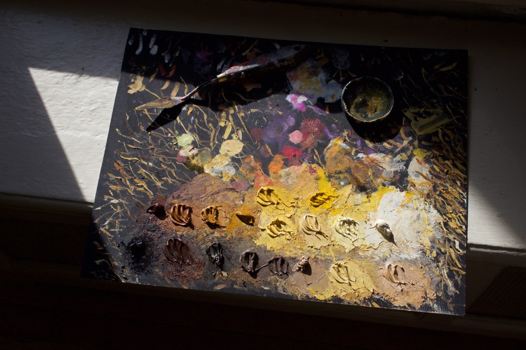 The painting is Virgilian in method in the sense that is tempers passion with disciplined devotion to vocation and craft. Both are necessary. When I displayed the painting at Parlor Gallery, I chose to display the palette next to the painting and titled it Underworld. The palette gives insight to the passionate process of creation that the composed and finished painting conceals. The waste material of the process that would normally be discarded and forgotten is here to be seen as a vision of an underworld.