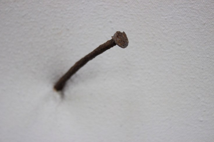 While listening to the quote during the lecture I got goosebumps. About an hour before I had hung on the wall a painting I made a month ago of a sparrow in flight, with a nail driven in the the canvas, piercing the surface and being driven into the stretcher bars.