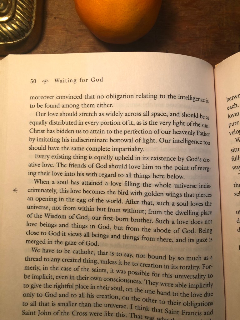 “When a soul has attained a love filling the whole universe indiscriminately, this love becomes the bird with golden wings that pierces an opening in the egg of the world. After that, such a soul loves the universe, not from within but from without; from the dwelling place of the Wisdom of God, our first-born brother. Such a love does not love beings and things in God, but from the abode of God. Being close to God it views all beings and things from there, and its gaze is merged in the gaze of God.”