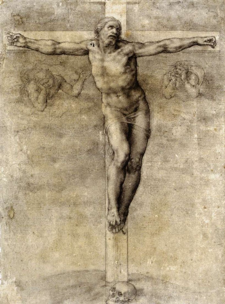 The drawing illustrates the “critical” moment of Christ’s doubt and despair, of “Father, why have you forsaken me?” For the first time in the history of painting, an artist tried to capture Christ’s abandonment by God-Father. While Christ’s eyes are turned upward, his face does not express devoted acceptance of suffering, but desperate suffering combined with…here, some unsettling details indicate an underlying attitude of angry rebellion, of defiance. His legs are not parallel, one is slightly raised above the other, as if Christ is caught in the middle of an attempt to liberate and raise himself; but the truly shocking detail is the right hand: there are no nails to be seen, and the index finger is stretched out – a vulgar gesture which, according to Quintilian’s rhetorics of gestures probably known to Michelangelo, functions as a sign of the devil’s rebellious challenge. Christ’s “Why?” is not resigned, but aggresive, accusatory. More precisely, there is, in the drawing, an implicit tension between the expression of Christ’s face (despair and suffering) and of his hand (rebellion, defiance)- as if the hand articulates the attitude the face doesn’t dare to express. Did St. Paul not make the same point in Romans? “I take delight in the law of God, in my inner self, but I see in my members another principle at war with the law of my mind, taking me captive to the law of sin that dwells in my members.” Should we therefore not apply here to Christ himself his own “antithesis” from Matthew 18:9 – “And if thy right hand scandalize thee, cut it off, and cast it from thee: for it is expedient for thee that one of thy members should perish, rather than that thy whole body go into hell”? A passage which should nonetheless be read together with an earlier one (6:3) in which a hand acting alone stands for authentic goodness: “But when thou doest alms, let not thy left hand know what thy right hand doeth.” Is Christ at this moment, then, the devil; does he, for a moment, succumb to the temptation of an egoistic rebellion? Who is who in this scene of Goethe’s formula Nemo contra deum nisi deus ipse – no one but God himself can stand against God? But what if we follow, rather, the Gnostic line and conceive the God-Father himself, the creator, as the Evil God, as identical with the devil?”